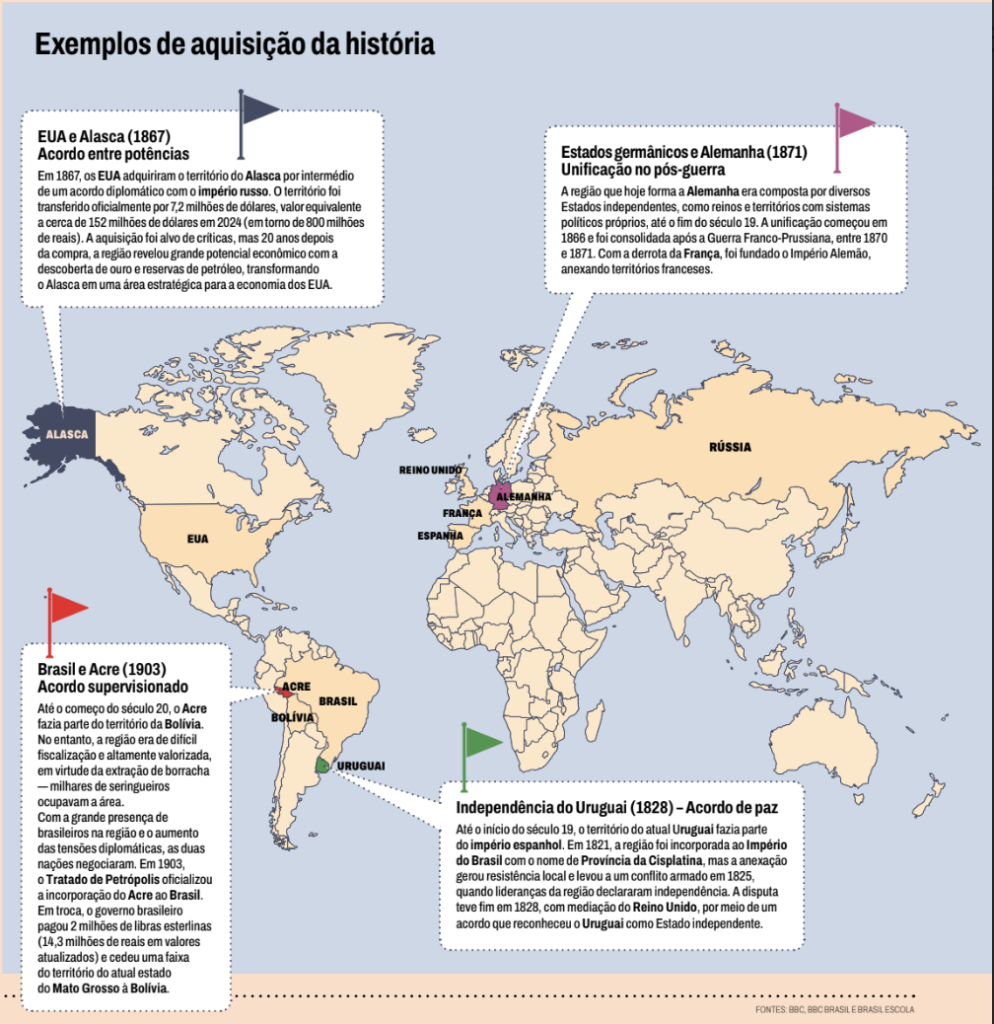A declaração reacendeu um debate antigo, mas central nas relações internacionais: afinal, como um território pode ser anexado ou incorporado por outro Estado? Ao longo da história, fronteiras foram constantemente redesenhadas por guerras, acordos diplomáticos, processos de unificação e disputas coloniais. O infográfico abaixo reúne os principais modelos de anexação territorial e exemplos históricos, que ajudam a compreender o cenário atual e refletir sobre os possíveis desdobramentos das tensões contemporâneas.