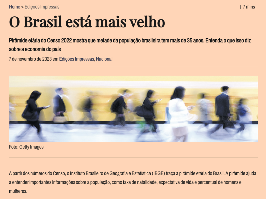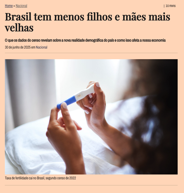 Em junho desde ano, a matéria “Brasil tem menos filhos e mães mais velhas” trouxe dados do censo que mostravam uma mudança de comportamento dos brasileiros que resultará em um envelhecimento da população. Quando a fecundidade cai abaixo do nível de reposição e se mantém assim por muitos anos, a população envelhece rapidamente. Isso significa que haverá menos pessoas em idade produtiva e mais idosos, o que pressiona o sistema de previdência social, saúde pública e outros serviços de assistência. Além disso, a notícia destacava que a escassez de mão de obra jovem pode afetar a inovação, produtividade e crescimento econômico de longo prazo.