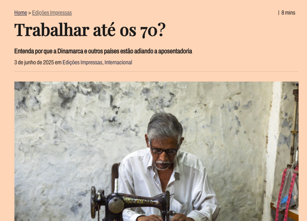 Trazendo exemplos de outros países, em junho deste ano, a edição 27 touxe a reportagem “Trabalhar até os 70?” sobre um projeto da Dinamarca que aprovou o aumento da idade mínima para aposentadoria para 70 anos. A medida reflete um desafio global: o envelhecimento da população. Com as pessoas vivendo mais tempo e menor taxa de natalidade, há menos jovens para entrar no mercado de trabalho. Com isso, os sistemas de previdência, que dependem do trabalho de quem está na ativa para custear as aposentadorias, enfrentam dificuldades para se manter sustentáveis.