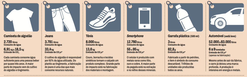 Quando você abre o armário, calça um par de tênis, veste uma camiseta ou segura o celular nas mãos, dificilmente pensa em tudo o que foi extraído da natureza para que aquele produto existisse. Mas cada um desses itens (e todos os demais objetos que usamos ao longo do dia) consome recursos naturais para ser produzido. O infográfico abaixo mostra quanto cada um consome de água e emite de gás carbônico (CO2) durante sua fabricação e faz um convite à reflexão sobre consumo consciente. Os números mostram que a fabricação de qualquer item que compramos tem um peso para o planeta. O maior problema é que o volume do consumo tem sido cada vez maior, a ponto de superar a capacidade da Terra de se regenerar.