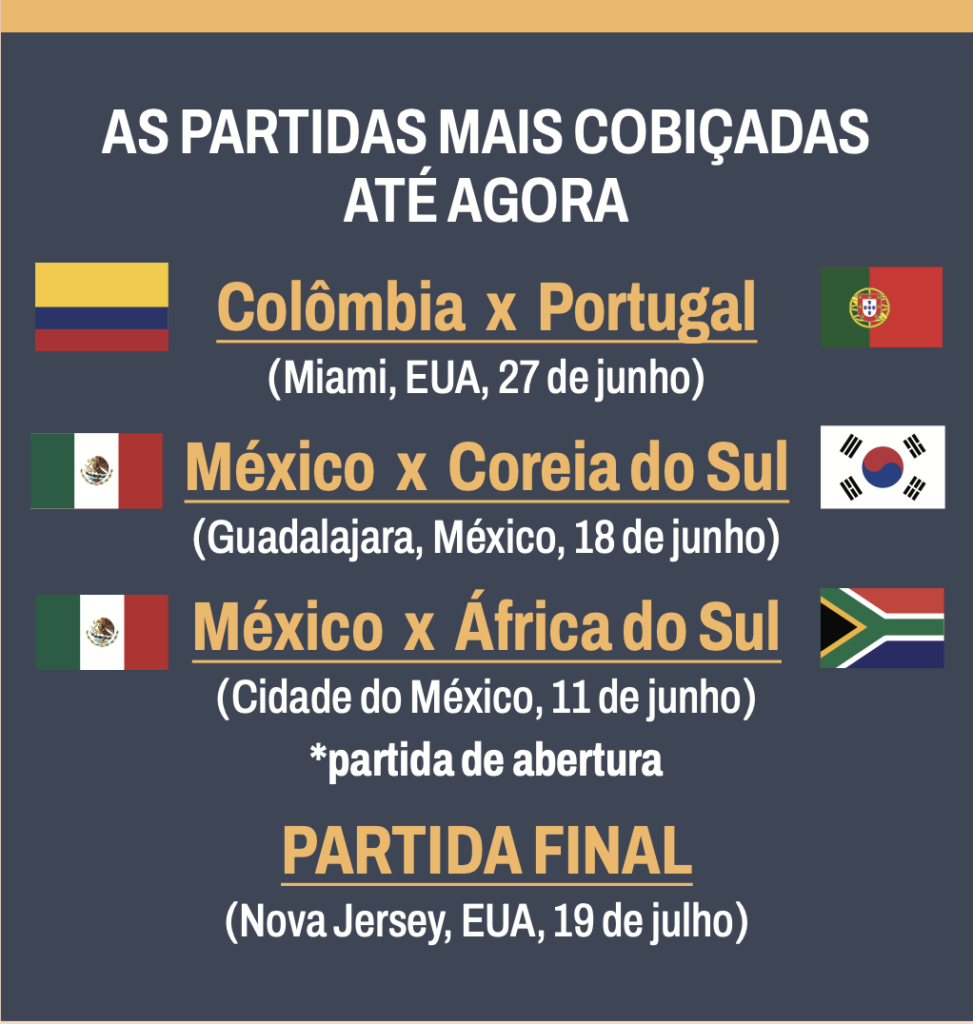 O torneio começa em 11 de junho e termina em 19 de julho de 2026 e será marcado por números inéditos. Será a primeira Copa realizada em três países-sede, Canadá, Estados Unidos e México, e a primeira com 48 seleções, um aumento em relação às edições anteriores, que envolviam 32 equipes. A ampliação do evento é apontada como um dos fatores por trás da alta na procura por ingressos.